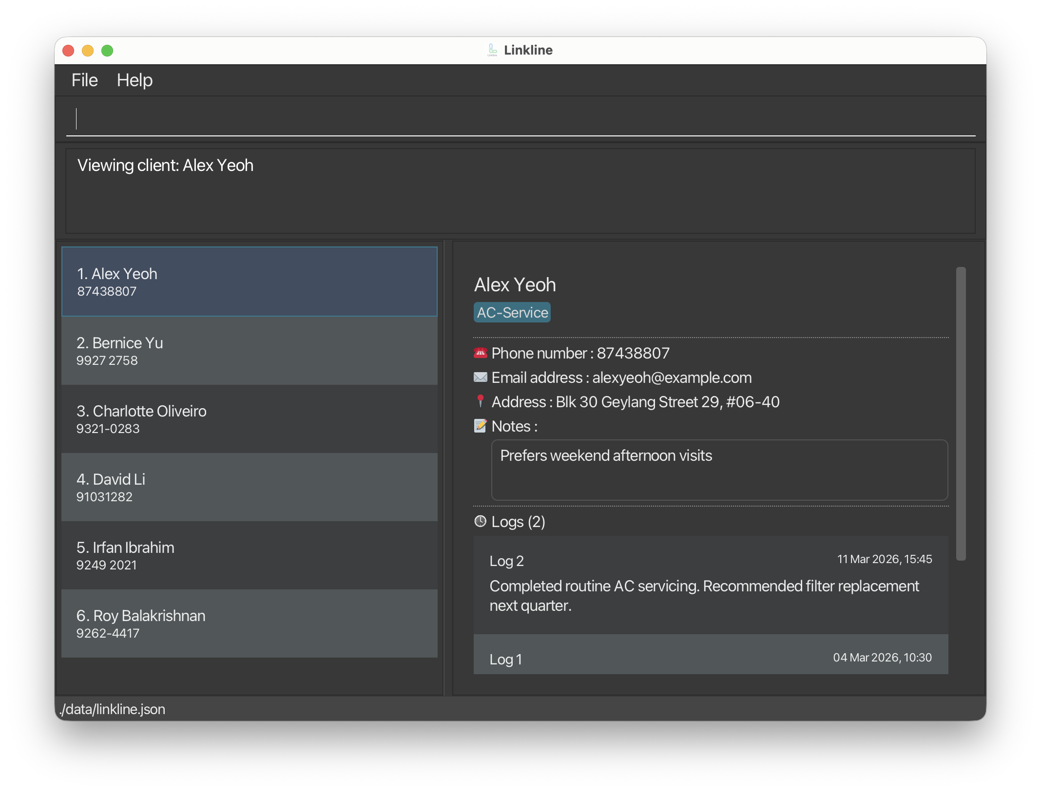 Linkline is a specialized desktop application for solo technicians to manage client details. It helps aircon cleaners, handymen and appliance specialists manage repeat customers. By coupling client contact details with critical service-location context, Linkline ensures you avoid mistakes on-site and save time between jobs.