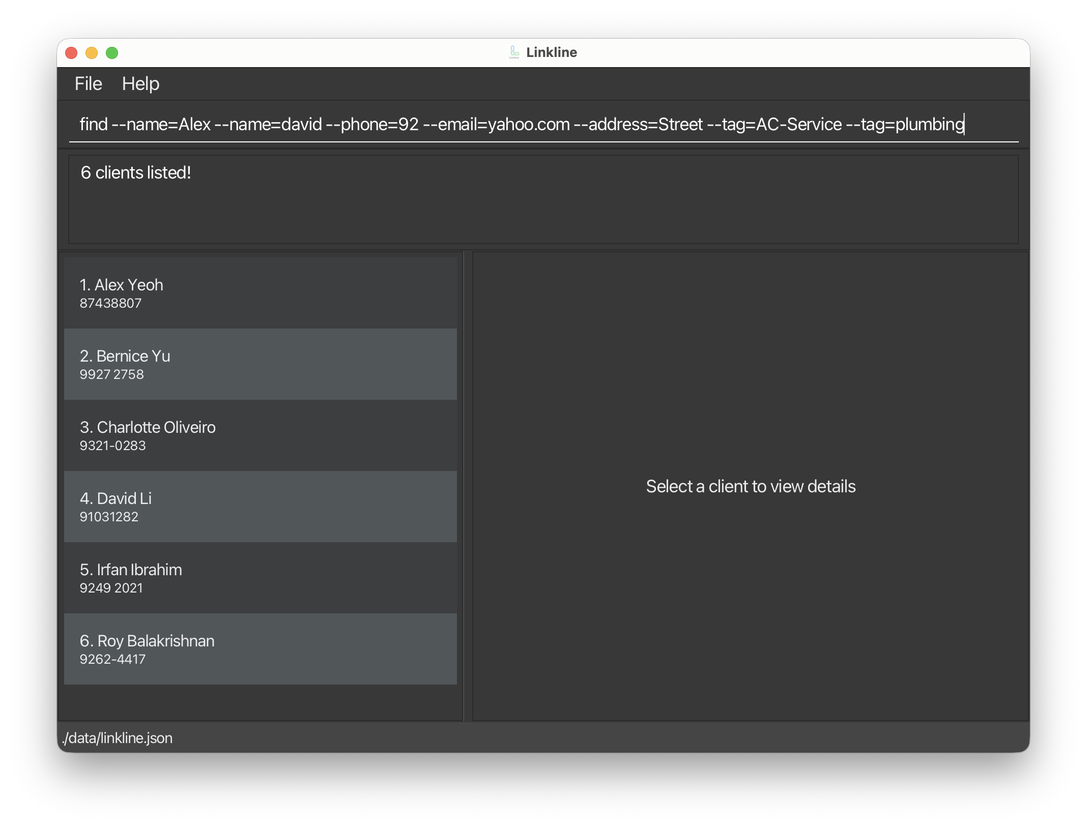 add --name=John Doe --phone=9876-5432 --email=johnd@example.com --address=John street, block 123, #01-01add --name=Betsy Crowe --tag=AC service --email=betsycrowe@example.com --address=123 Clementi Rd #04-05 --phone=9123 4567 --notes=Gate code 1234, beware of large doglistShows a sorted list of all clients in Linkline.