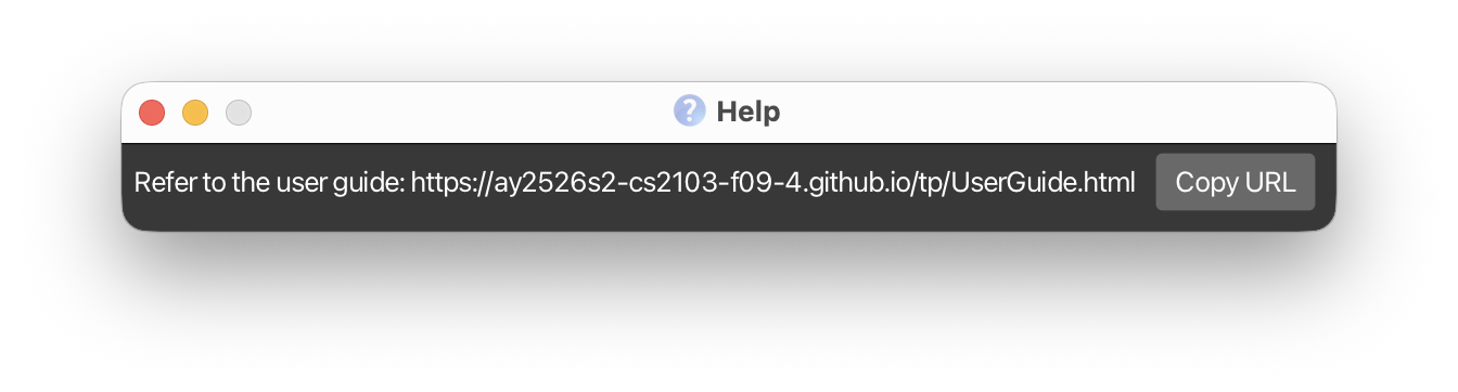 NAME: must not be blank, up to 100 characters.PHONE_NUMBER: must contain 3 to 15 digits in total. Spaces and hyphens are allowed only between digits.EMAIL: must be in valid local-part@domain format and satisfy email length/rule checks.ADDRESS: must not be blank.TAG: must not be blank, 1 to 50 characters.NOTES: 0 to 200 characters.LOG_MESSAGE: must not be blank, 1 to 1000 characters.helpShows a message explaining how to access the help page.